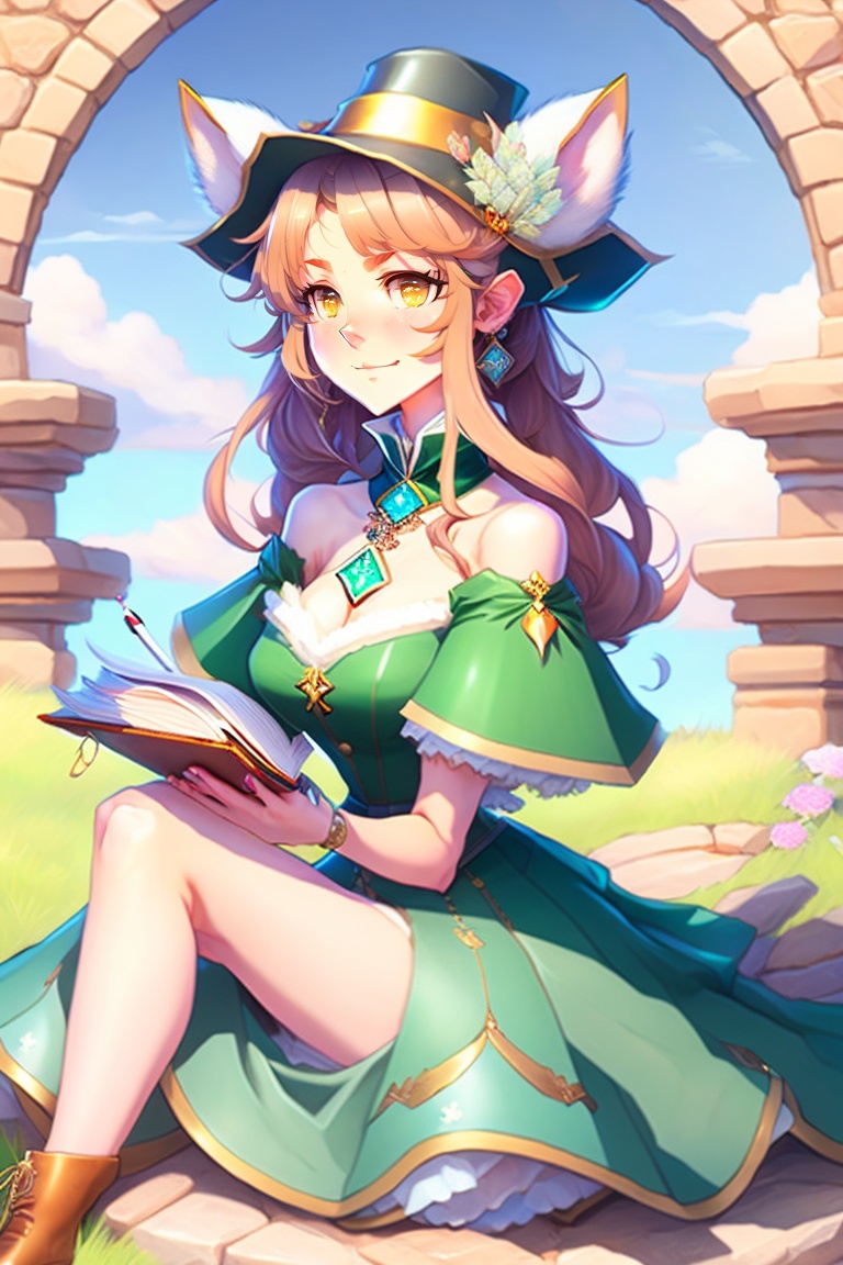 Wizard, woman, fluffy, Fox sitting on shoulder. Table, reading Spellbook. prismatic, water. Pale White Skin. Dark Brown Hair. Green-Gold Eyes. Sky Blue Dress. wizard hat. Anime, copic, full body shot, Beautiful Woman. Tetradic Colors. official art, best quality, highres, masterpiece, extremely detailed summer dress, sharp focus, depth of field, extremely detailed face, soft lighting, 8k, professional commission