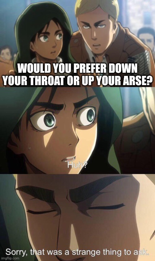 @NotaNuffian : Would you prefer down the throat or up the arse? @ElijahRyne : Huh? @NotaNuffian :Sorry, that was a weird question to ask.