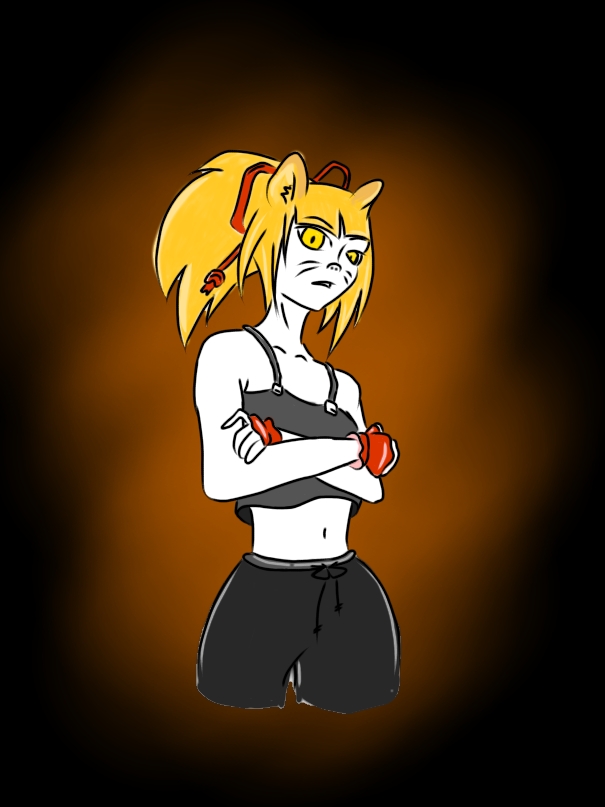 Description: Anne is a humanoid with lion-like ears, but no tail. She stands at about 1.80m tall, has long golden hair tied into a ponytail with an equally golden bracelet and a permanently grim expression etched onto her frame. She is 18 years of age, pale-white skin and a body full of scars due to past traumas. She is very athletic, but not overly-muscular aka toned. Her eyes are pearly white, while the iris itself is a pale gold.