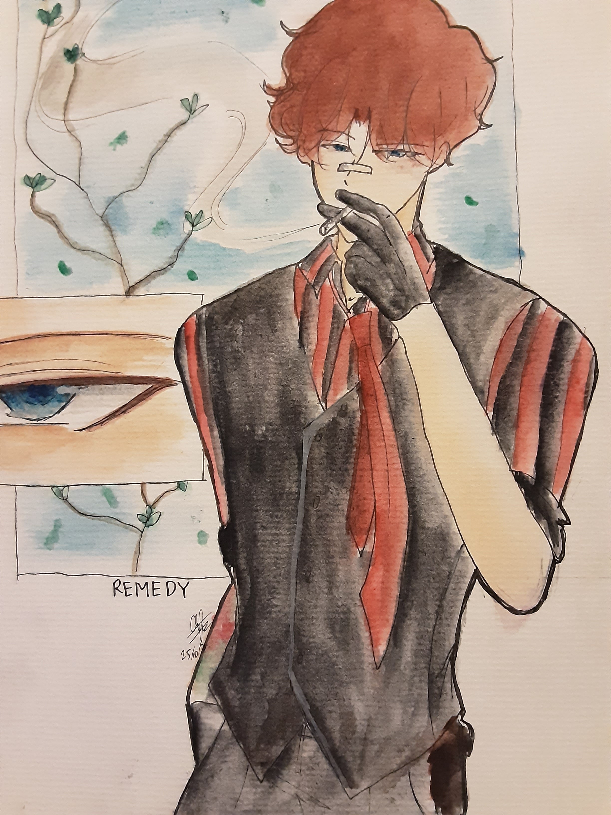 His color scheme is mostly red and black. For the lower parts of his body, he only wears slim black pants and shoes. And as for his right arm, he has a tattoo of Red Roses and thorns to go along. Take your time to reply, I don't want you to force yourself since you had open this request here and on Discord.