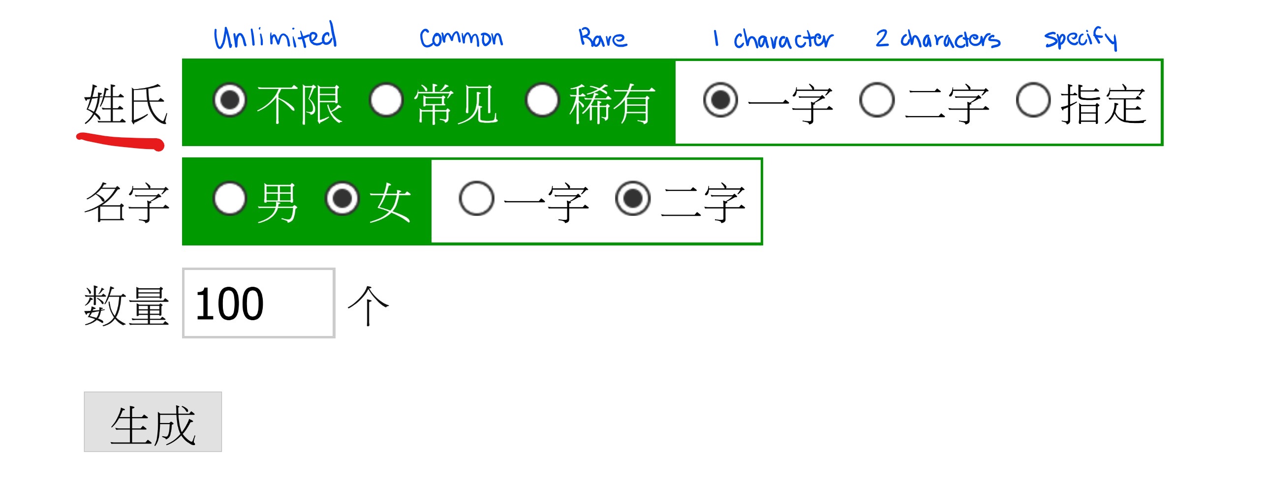 Let's start with the surname options. In the green field, you'll find the rarity options, and in the white field, you'll see the options for the length of your surname. From left to right, the options are unlimited (generates surnames of any rarity), common (one of the top 100 surnames in China), and rare. In the white field, from left to right, the options are a 1 character long surname, 2 characters long surname, or a specific surname.