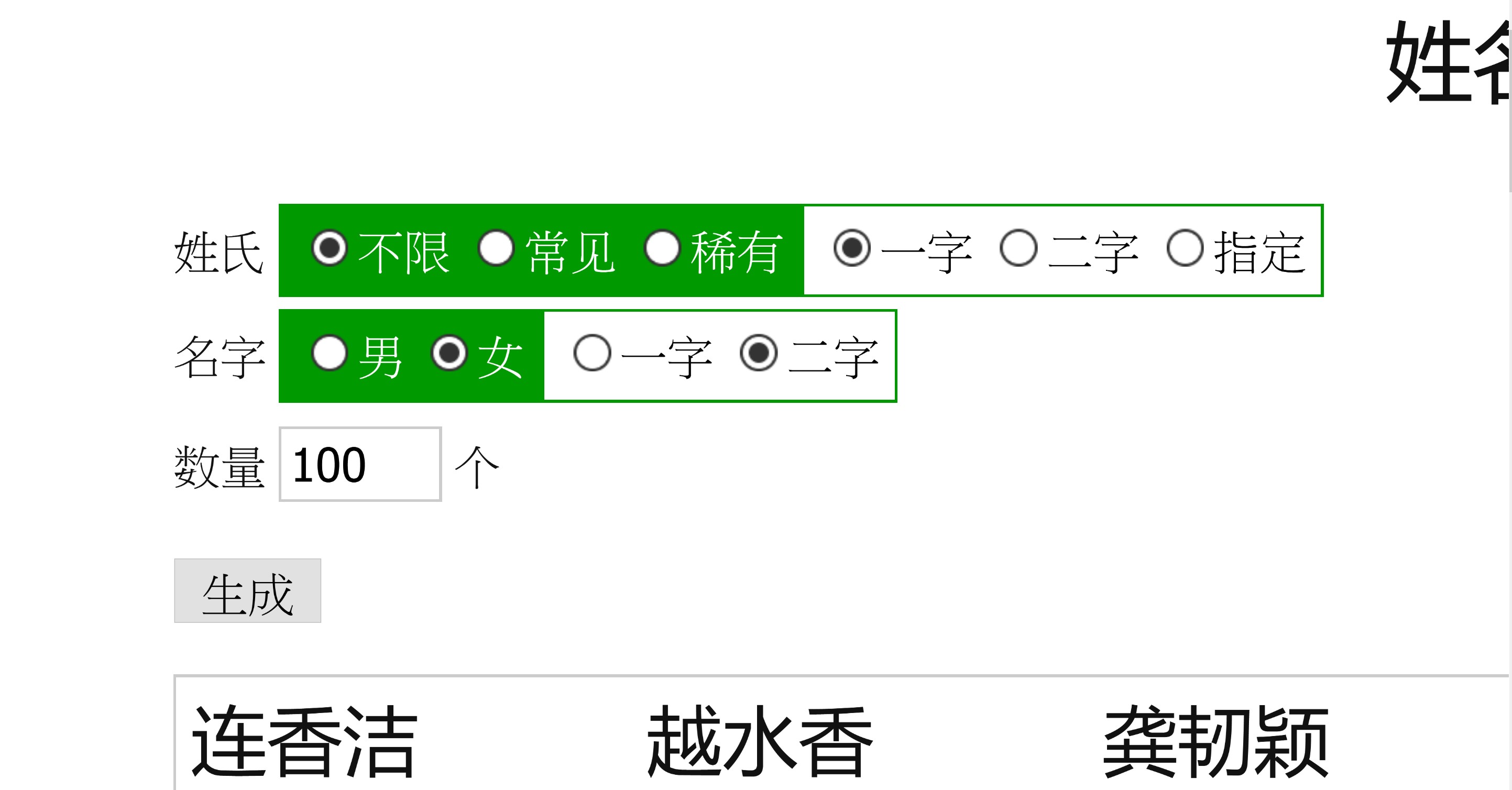 The line of text under these options translated says: Enter the last name, such as "wenren", you can specify the last name, if you need a random last name, please leave the last name blank! You can choose one-character or two-character names, male names, female names, and fill in the number of generations! If you are not satisfied, click repeatedly to generate.