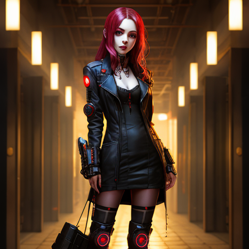 I humbly ask you to make a full body art of a tall, slender woman with a brown ponytail. Black cargo trousers, colorful leather jacket. If you can, use the same prompts and make both b and c.