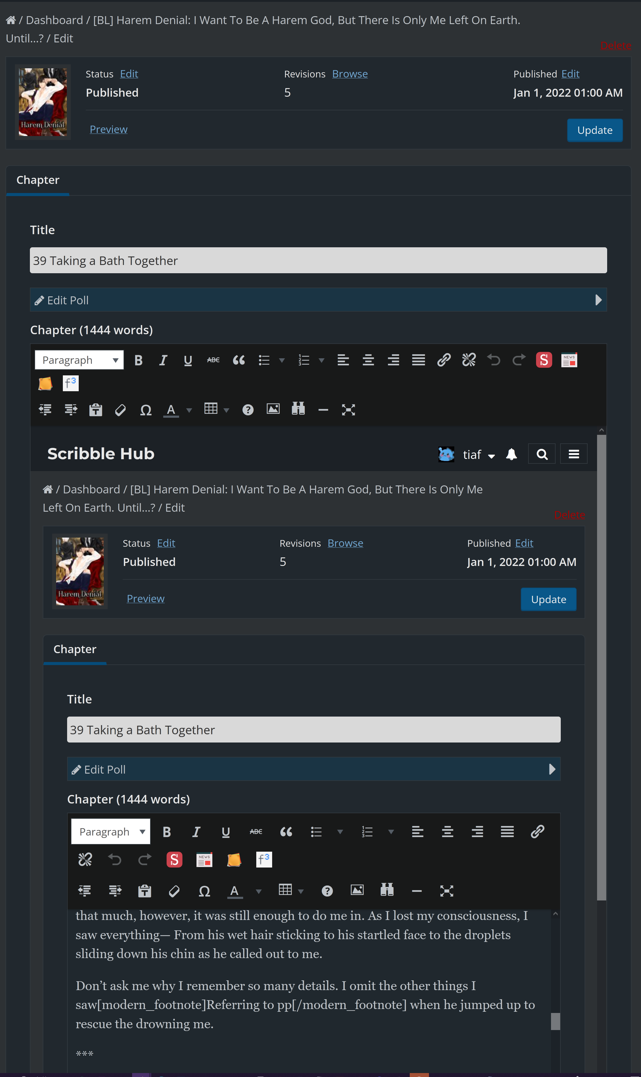 But the last chapter I uploaded was unedited and I only had time to edit it a few days after publishing. After updating the chapter, all the spaces between the paragraphs suddenly doubled. The problem doesn't appear when I edit the chapter shortly after I publish it.