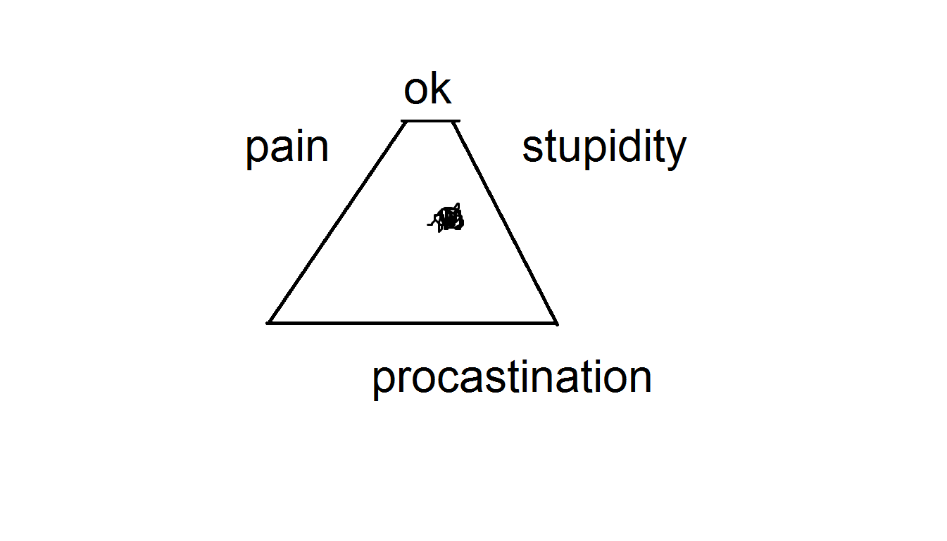 ok that also won't be accurate. No i osilate between tree things. Stupidity procrastination and pain. sometimes there is happiness.
