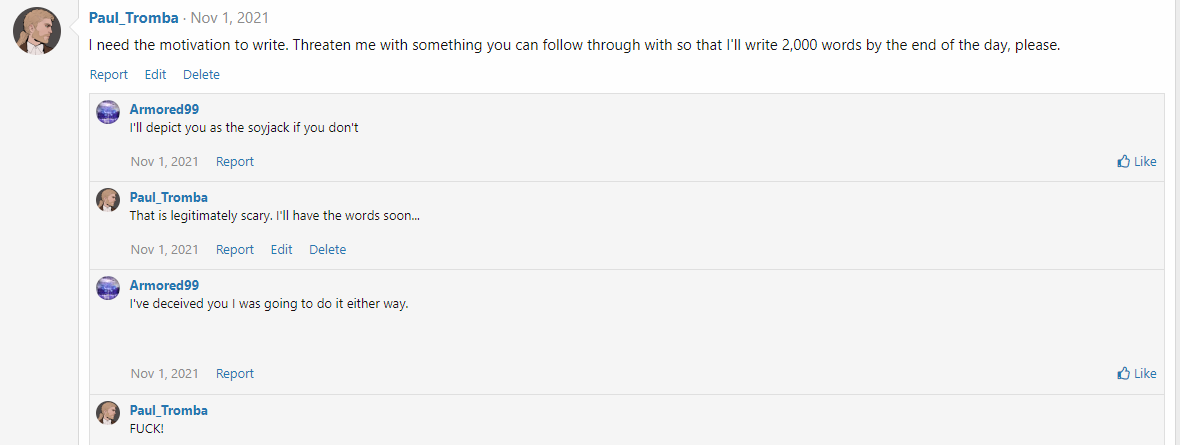 It's like comedic ADHD. We make the joke, we laugh, and then it vanishes. My meme/reaction pile has increased because of it and there's several images I have for those one-off jokes that I simply cannot use again because of some of the shenanigans here. Where they came from, where they go, and what they are in reference to, I have long forgotten, but they're there.