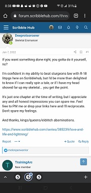 Note that my nice picture signature isn't displayed, but the direct link is. I'm willing to bet my femur that more than a few readers lurk the forums on their phones, I did for an entire year before coming to SH. Very rarely did I go through the effort of copypasta-ing a user's handle into google to find their works the hard way, and I suspect that the average reader is even lazier than I am. So don't say "follow the link in my signature" take your targets gently by the hand and yeet them over to your piece with a link in the post itself.
