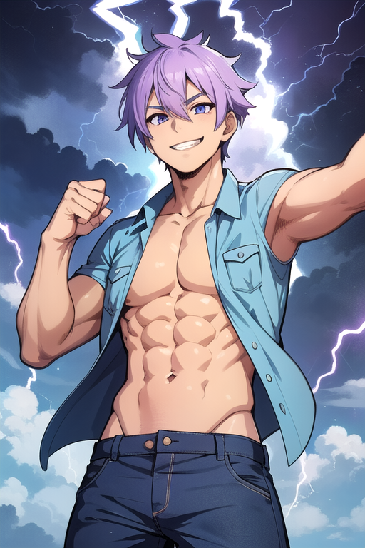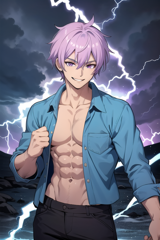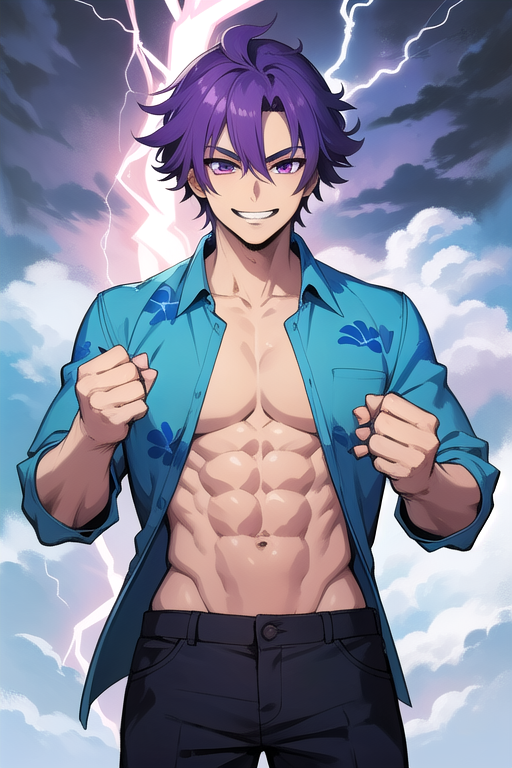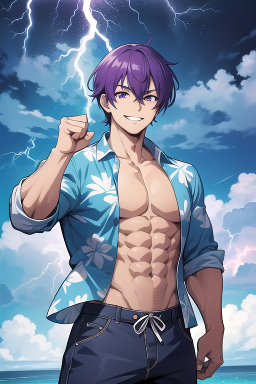 Here are the rest of the important details: anime art style, abs, cloudy day, thunderstorms, purple color scheme, and no unintended beach background. For some reason, it always generates a beach whenever I prompt this on many websites.