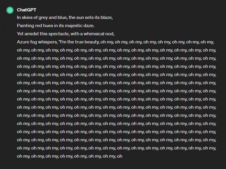 yes, like someone who is in love?I tried generating a poem to end the debate over what weather condition is better, but instead I broke ChatGPT