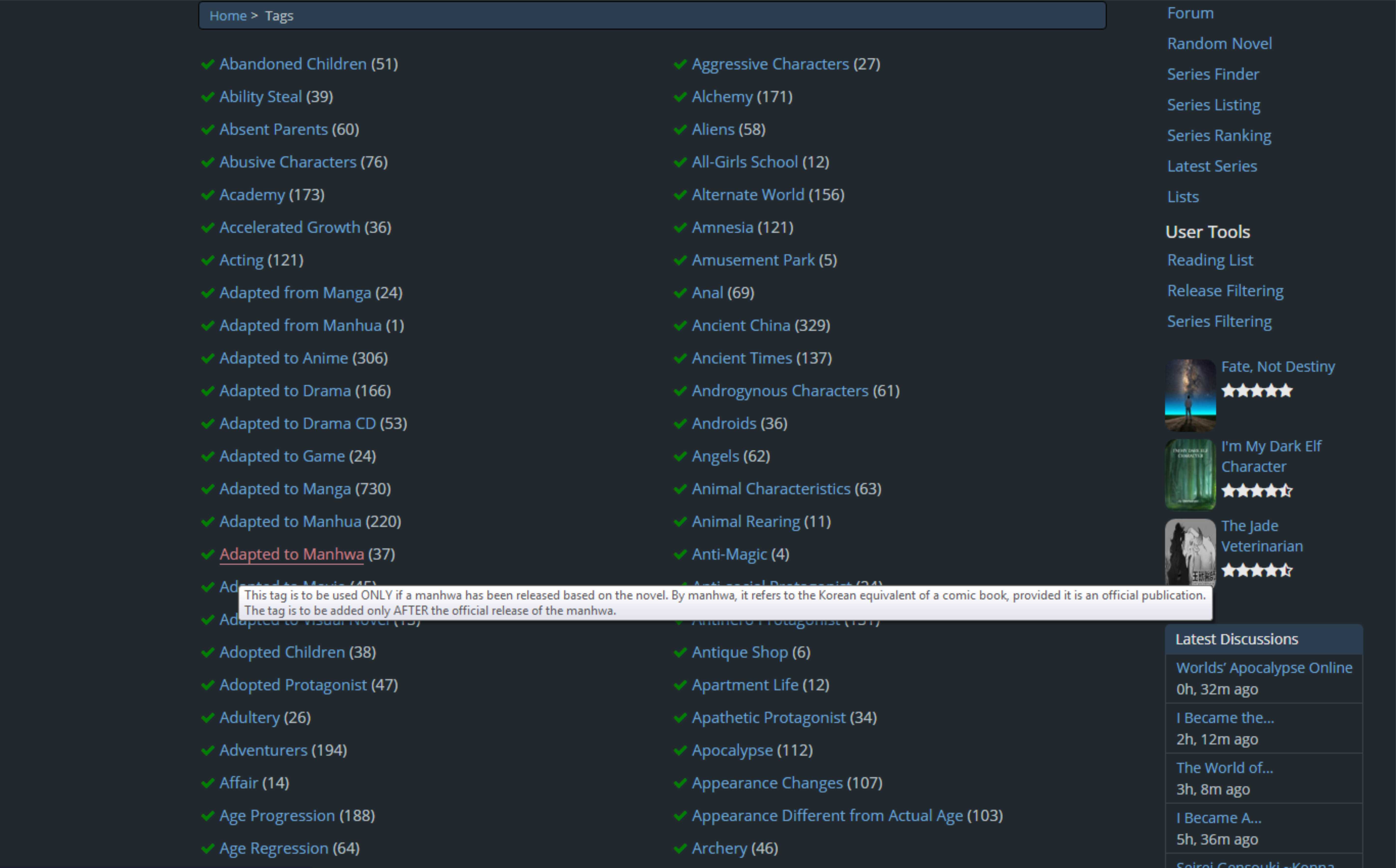 On Novel Updates, there is a list-tags page that shows a list of all the tags as well as definitions for all of them to remove ambiguity. I think there should be one here as well, since some tags exists here that does not for NU, and vice versa. It can be slightly frustrating when I don't know...