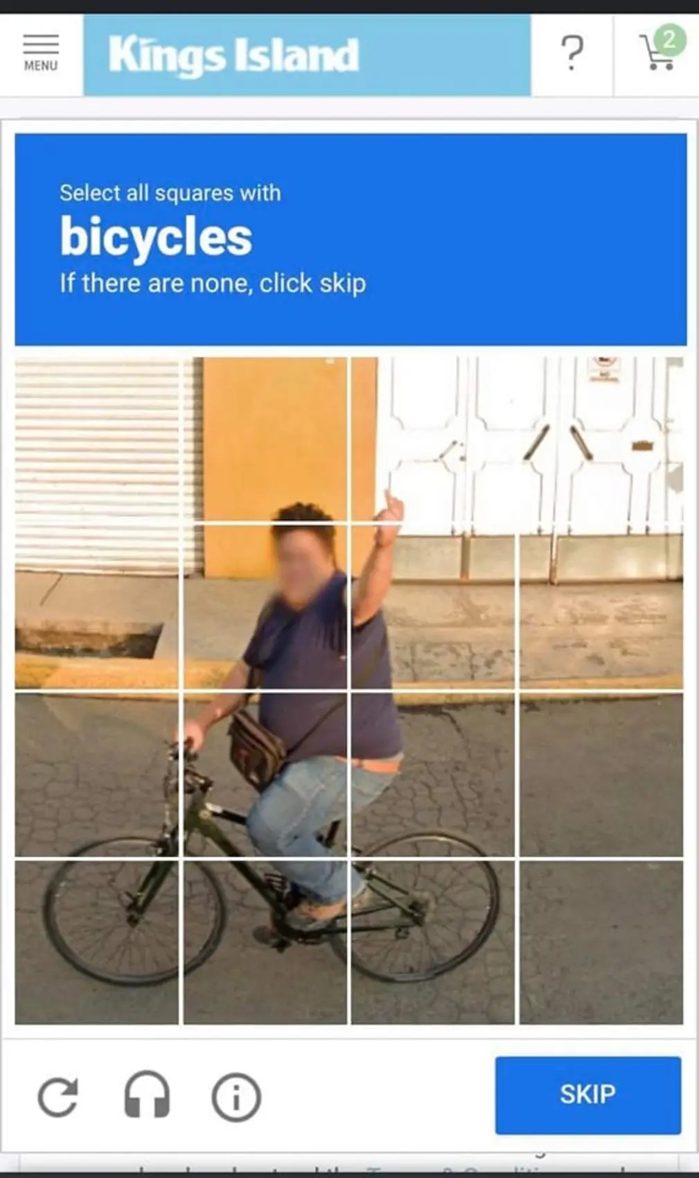 It's asking for bicycles plural, not single, so I will click skip.Prove it! Solve this captcha!