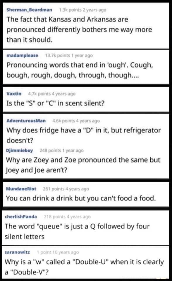 The forth one has an explanation, W was originally written as UU, hence the name, double-u. But stupid calligraphers thought such a round letter looks silly and began writing it as w instead of uuI raze you ...