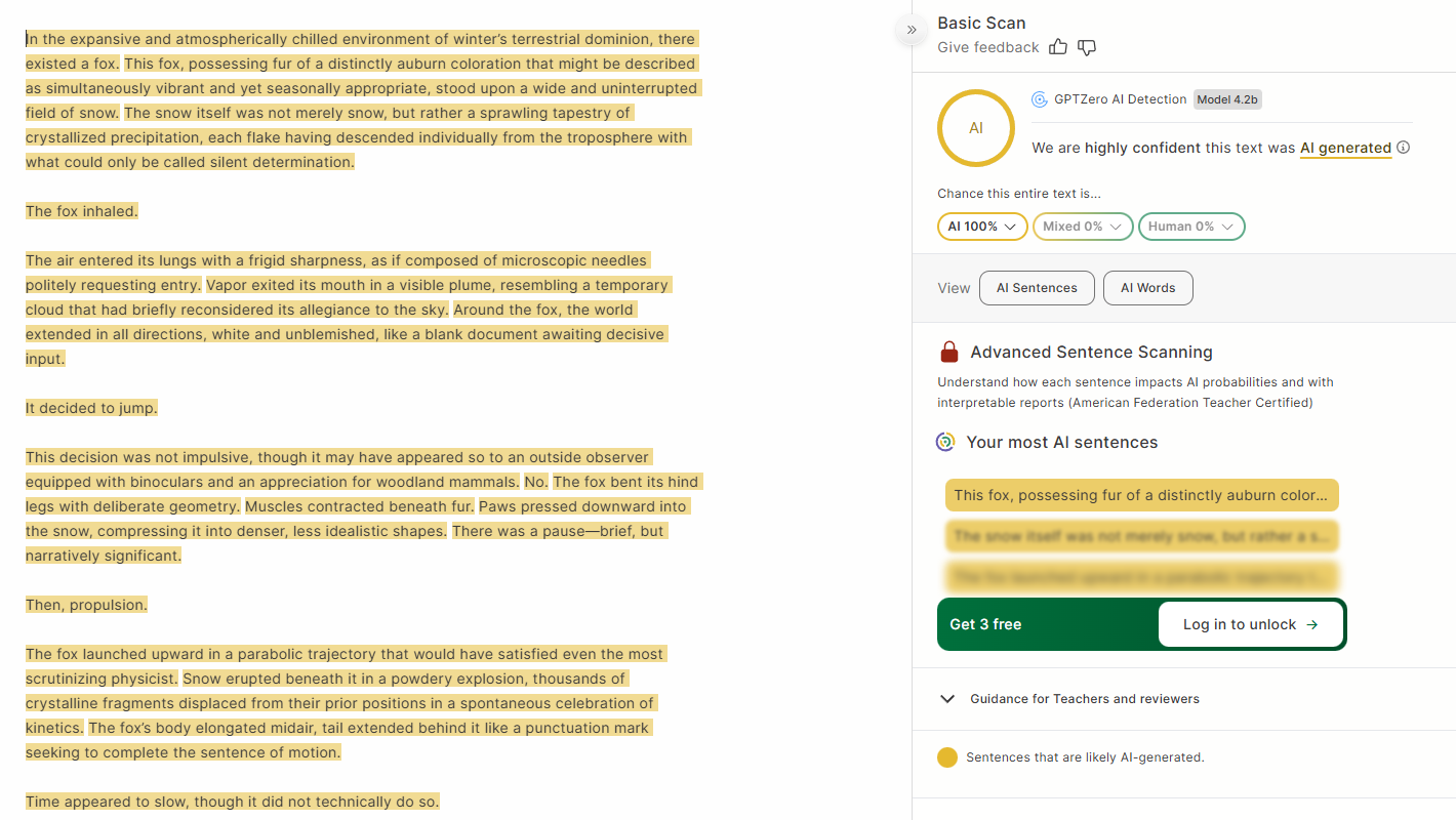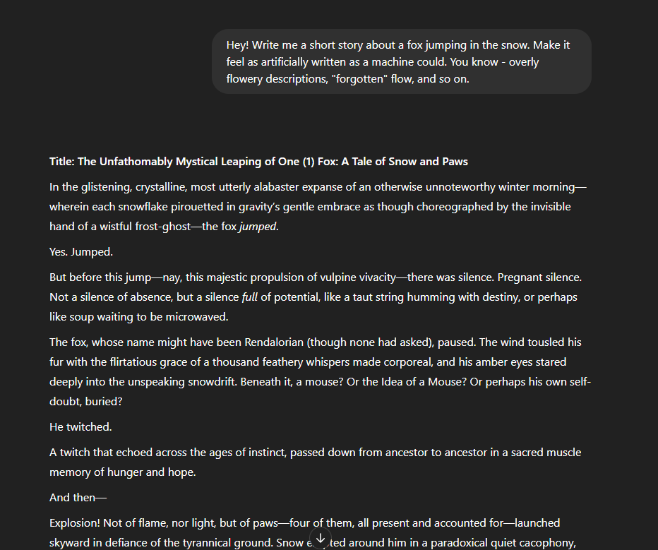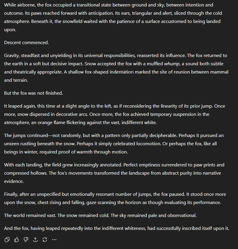 In the glistening, crystalline, most utterly alabaster expanse of an otherwise unnoteworthy winter morning—wherein each snowflake pirouetted in gravity’s gentle embrace as though choreographed by the invisible hand of a wistful frost-ghost—the fox jumped.