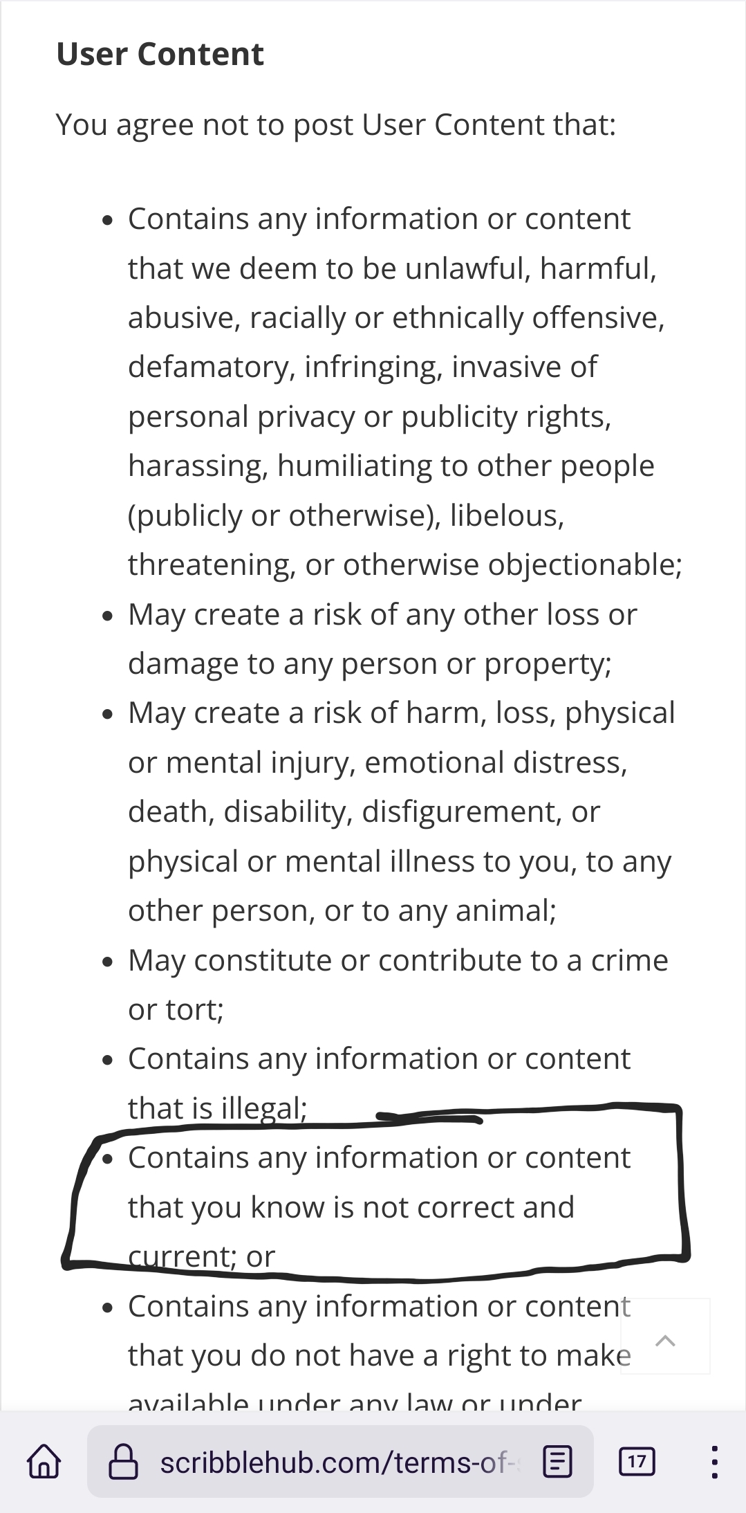 To quote myself when I evaluated the CG and ToS line by line: "As all of the above are influenced by other people's actions, this is out of my control. I am not a Goddess. I have, however, taken caution to advise readers of upcoming subject matter by means of Content Warnings, I have not written in any dangerous instructions to do anything, nor instructions to do anything dangerous, and I have displayed additional diligence in this announcement..."