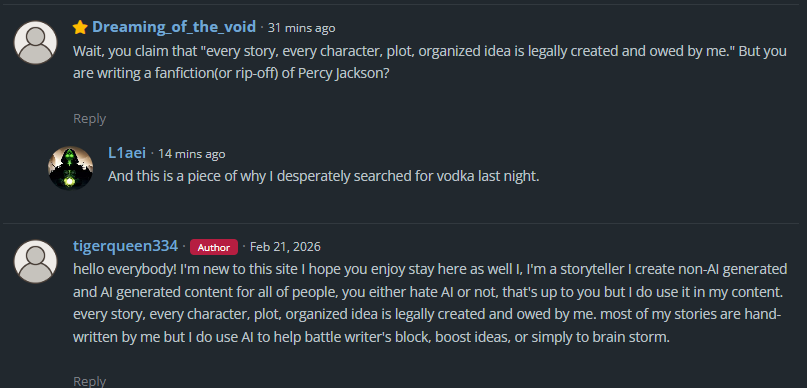 I like to think I’m not that against AI compared to most other creatives. Hell, I’ve been subscribed to ChatGPT for almost a year now. What I don’t get is, why would anyone use AI to write stories for them? It can’t just be because they think it’s easy money, right? Because there are much easier ways to make money using AI that take waaaay less time.