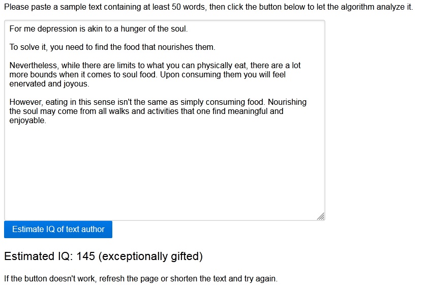 i tried it on wikipedia articles and essays by ralph waldo emerson, on some sophisticated ones, they do have around 130 to 140 in average.
