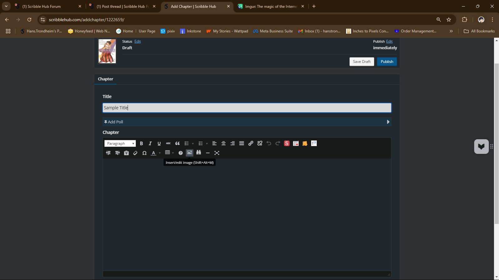 4) Go to your ScribbleHub Novel. Click "Edit" on the chapter you want your image in. Move your cursor to the part of the chapter you want your illustration to appear. On the taskbar at the top of the UI, click on the "Insert/Edit Image," then paste the link you copied on the "Source".