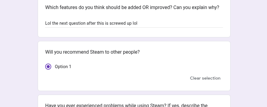 Soo funny story, we got an assignment to do a survey on Steam UX for our college class, but we're not pulling the numbers required for the minimum amount. That's why, I'm here to beg ask you guys to fill this form (It's pretty short