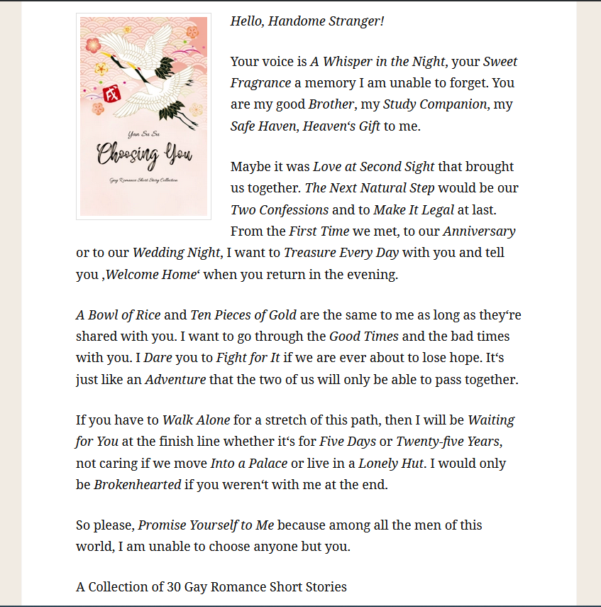 And this is why I asked readers :blob_sweat: I know it's not an often-used style but it's supposed to be reminiscent of a love letter since it's a romance collection. It's setting the tone of the included stories and gives an overview while in a sense adding yet another story to the collection. So it was deliberately done in this way.