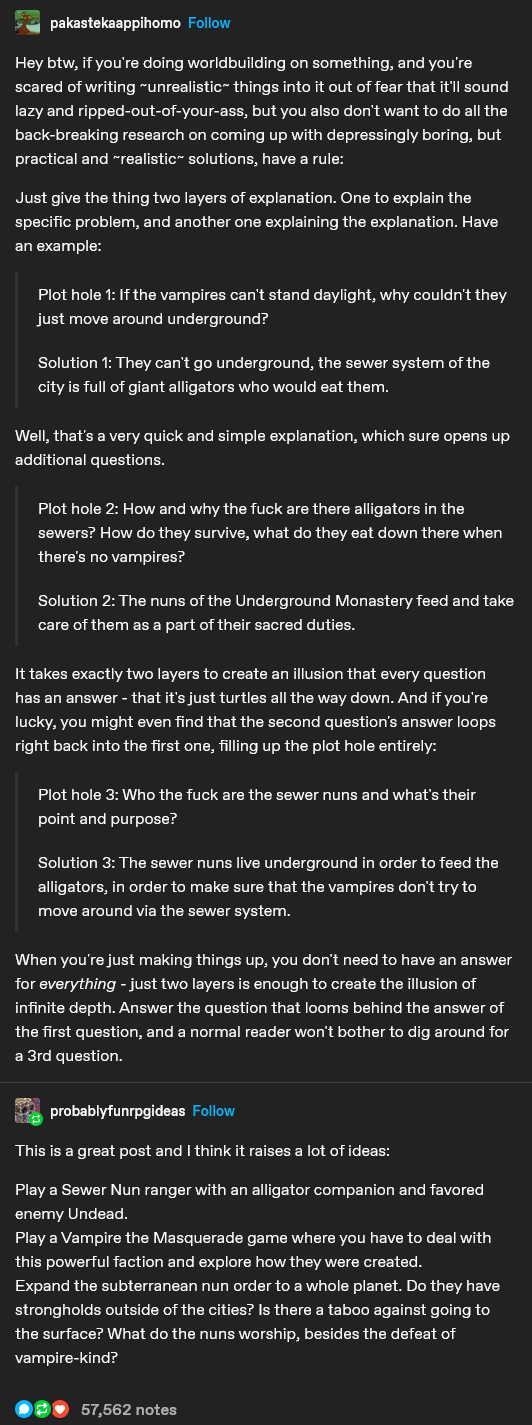 Explaination: Then, explain why that explanation exists in the first place. This meta-layer gives your first answer roots in your world’s history, culture, science, or politics. It makes the explanation feel like it’s been there long before the reader arrived, giving depth without needing to simulate an entire textbook.