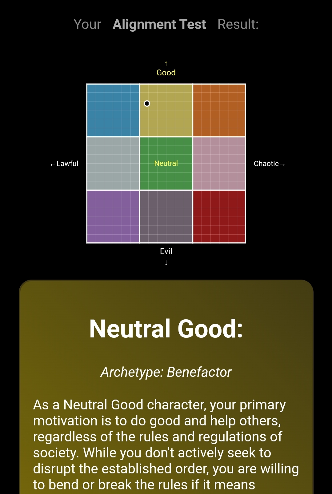 I was in the space one up and one right from you.On dnd test: Full good, deep enough into lawful to not be an edge question/still on the right side because I am always right.?