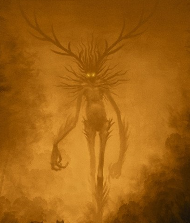 I like this one from my supernatural time traveler story. (The smaller thing next to it with wings is a normal Fae). I have dubbed it the Willowisp in my story. A twenty-foot-tall mass of midnight black, bone-tight skin, weeping willow branches for hair, and an animal or human skull for a head and haunting yellow eyes.
