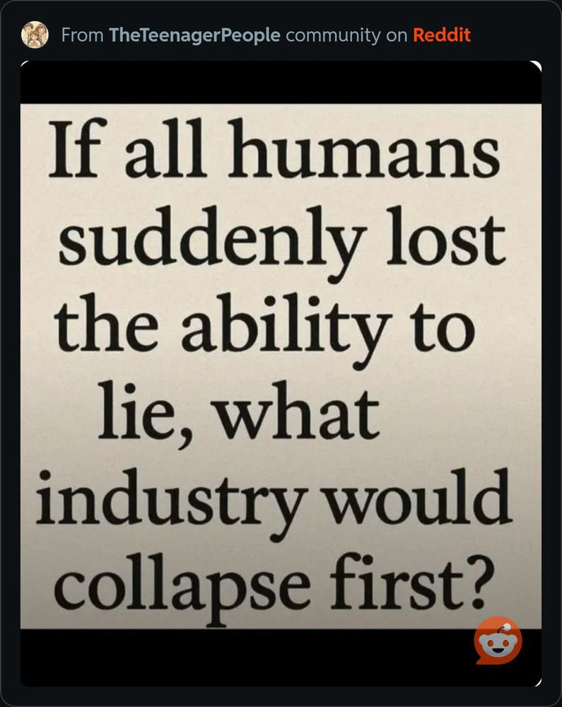 Incorrect. It would be the makeup industry first. They would no longer be able to make any concealer. It's right there in the name, people, makeup is a lie your face tells people's eyes. The Government wouldn't last much longer, but not being able to lie and avoiding the question altogether aren't the same thing, so they could BS their way through for a while.