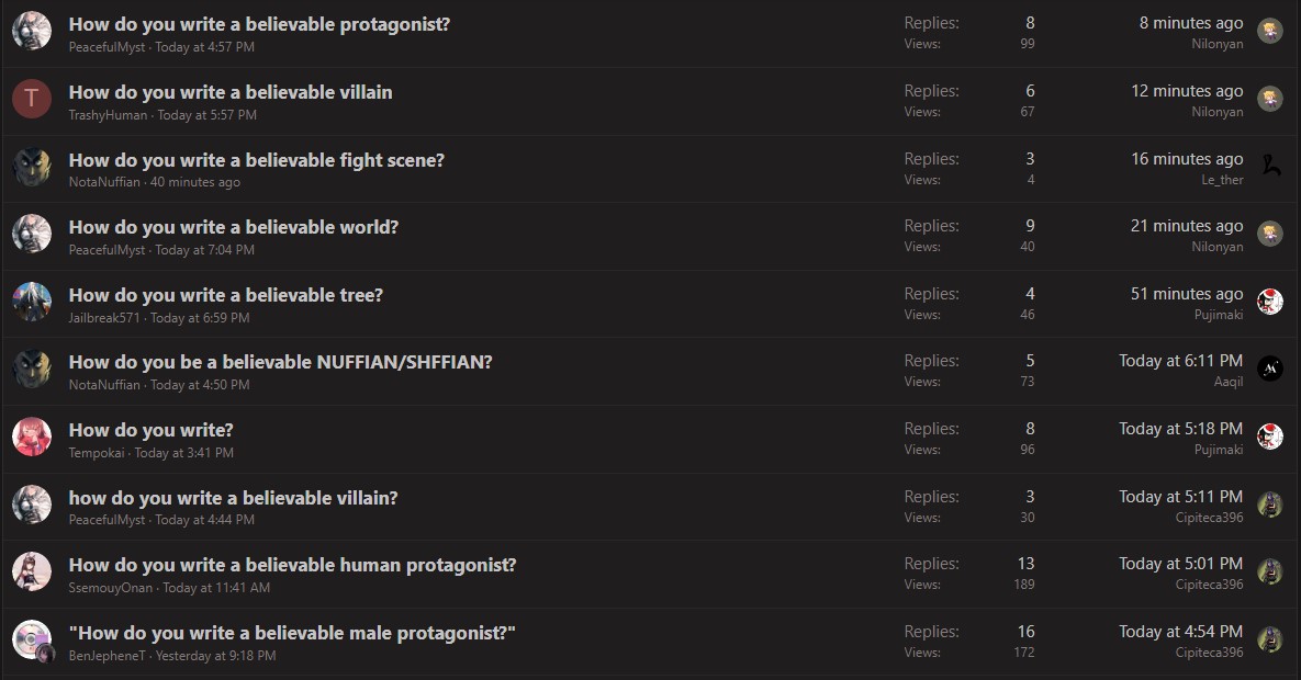 - Kilolo Niemöller (2019 - 2022) Writing Prompt Creator and Serious Forum Supporter