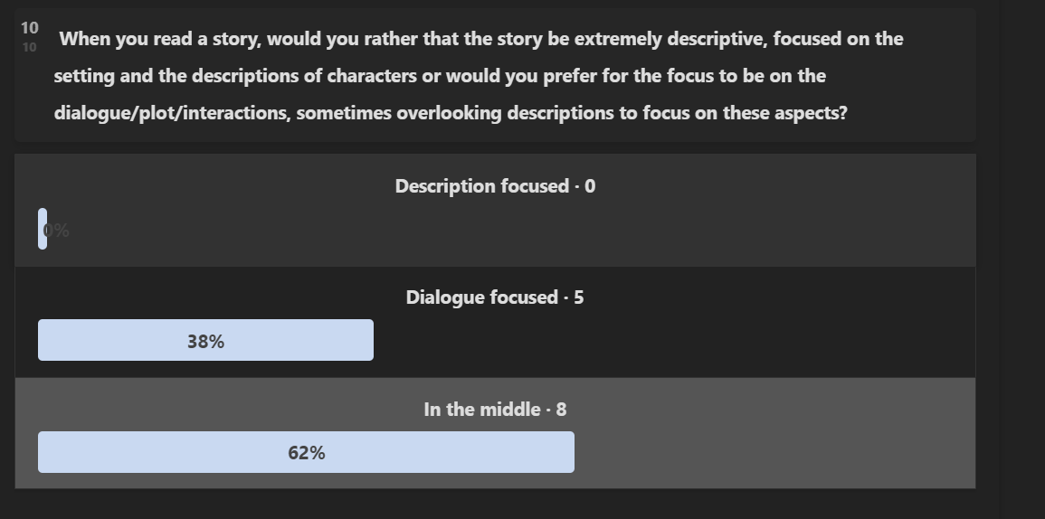 As you can see, there were a total of ZERO people out of 13 who prefer a story that focuses on description over dialogue.