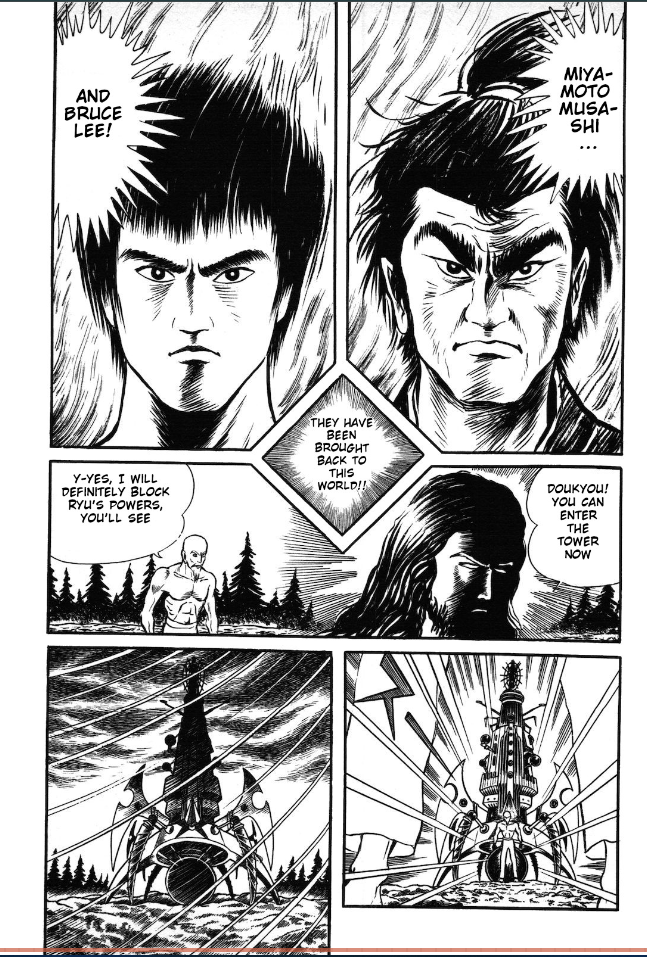 Also as I said I don't remember if it was Buddha or Jesus but I remember he resurrected Musashi and Bruce Lee as his generals. Not sure what they are going to do next but that's the page I saw and my friend explained as such to me.