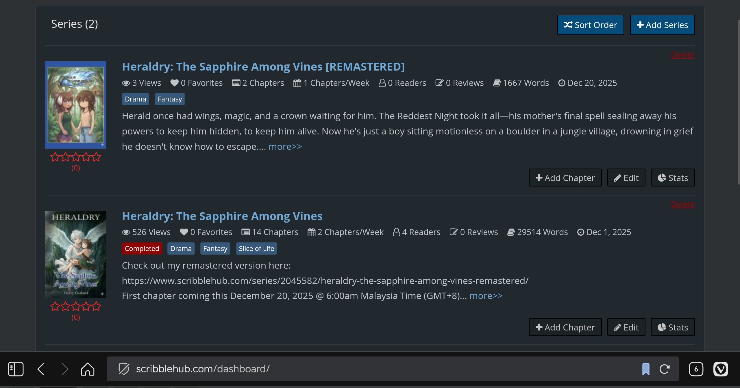 Yesterday I discovered that my two series, "Heraldry: The Sapphire Among Vines" and "Heraldry: The Sapphire Among Vines [REMASTERED]" cannot be found when I search for it on ScribbleHub Home Page. My original series had a ranking of #91 on Tribal Society. Now it's gone.