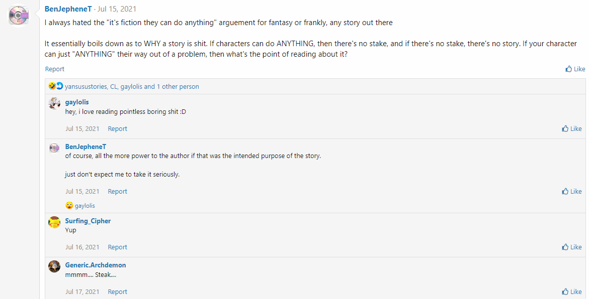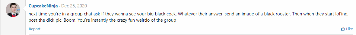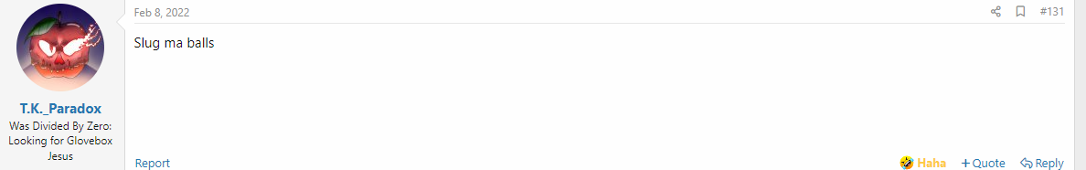 Could each of you share your favorite funny posts on the forums? They can be from threads or from profiles. There is no limit to how many to share here so please share to your heart's content. Please share via the quote button, screenshots, and/or link to the post. Here are a few screenshots to give an idea of what I'm talking about. Things that would make most people who see it think this,