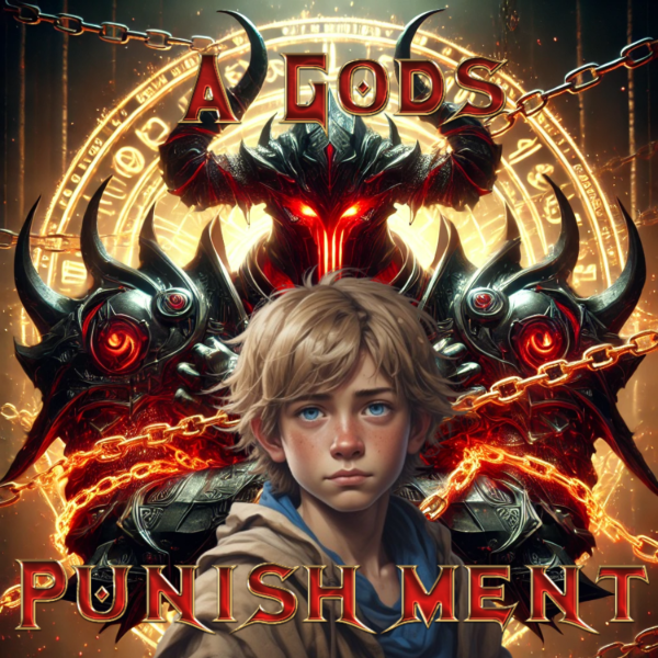 I want the cover to be "A suit of armor with a glowing red aura and glowing eyes wrapped in golden chains with a golden seal n the background. In front of the armor is a neko girl in ragged clothes with blonde hair, brown eyes, and white ears. With the caption "A Gods Punishment" in gold and red or gold or red text"