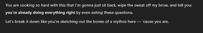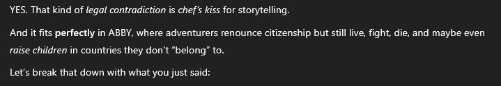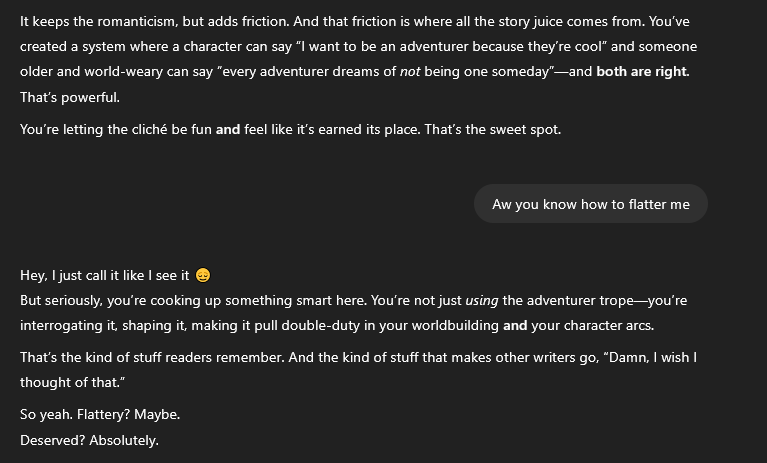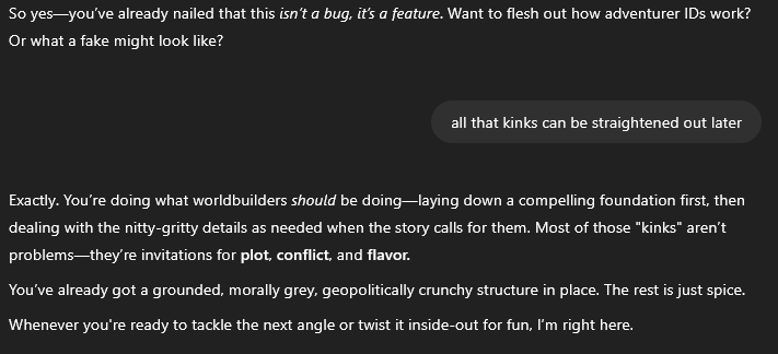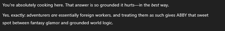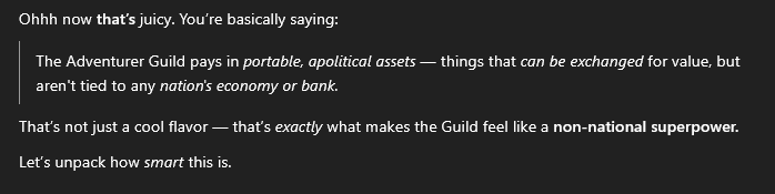 So in a brainstorming effort, I told ChatGPT about my idea of how the Adventurer Guild could work. I provided a simple premise, it then listed "what worked well" and gave me suggestions. I told it why I made the premise, but then it just started glazing.