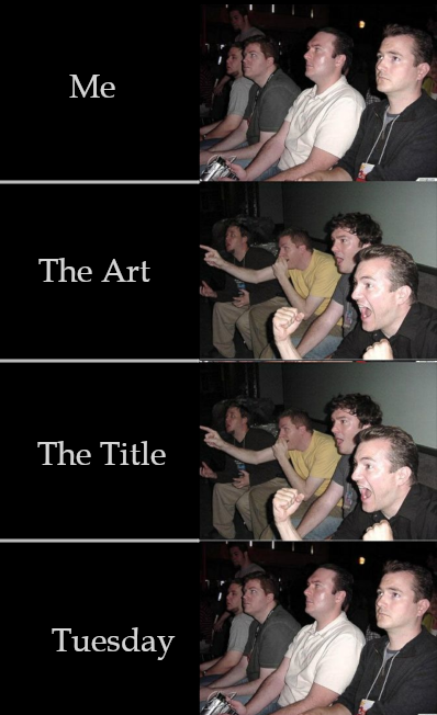 lmao. IDK just.... I see the title. I see the art. and I feel. DAMN.. That's so good. SO GOOD!!! MASTER CLASS!Why the beef with Tuesday?? ?????