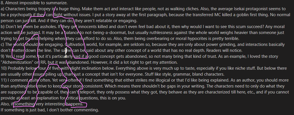 11) I comment quite often. Yet very often if I find something that either strikes me illogical or that I'd like being explained. As an author, you should more than anything else strive to keep your story consistent. Which means there shouldn't be gaps in your writing. The characters need to only do what they are supposed to be capable of, they can't teleport, they only possess what they got, they behave as they are characterized till here, etc., and if you cannot provide at least an explanation for critical questions, this is on you.