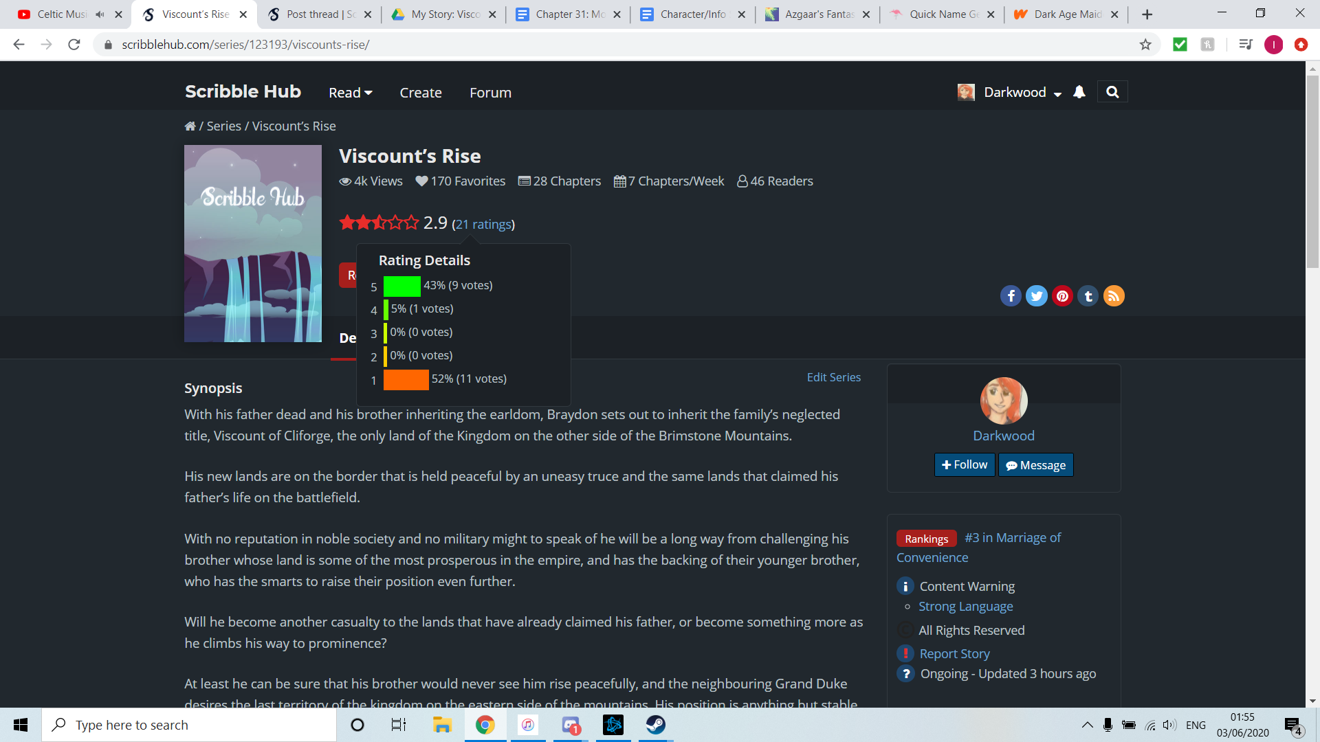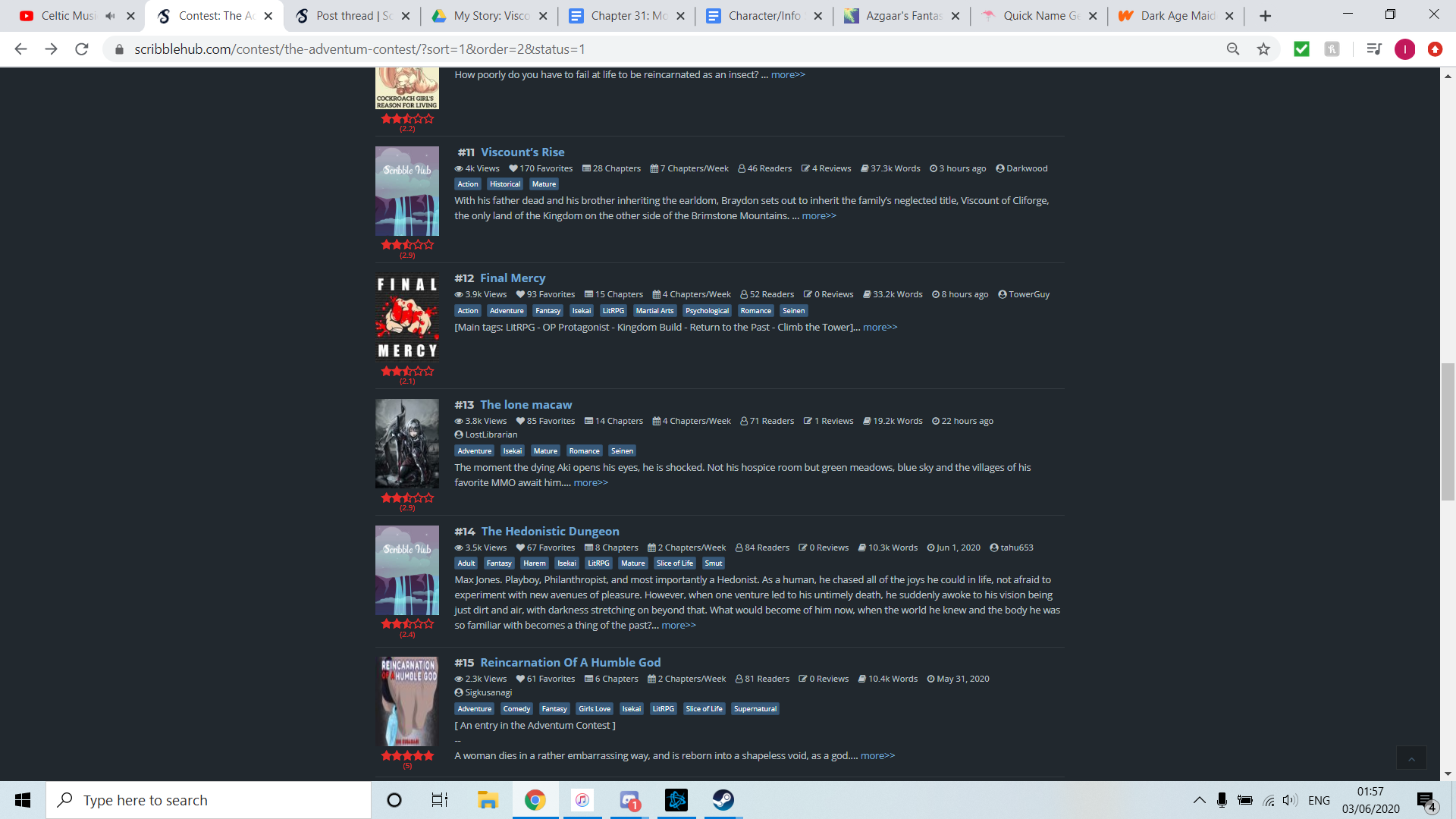 So I was looking at my novel's page to check the views, I do this compulsively. And I found that in the 20 minutes since I had refreshed the page, I had gotten 11 one star ratings out of nowhere. There was no massive jump in page views or chapters read and for the past 2 or 3 weeks since my novel has gone up I have had a total of 10 ratings (9 five star and 1 four star). And by the looks of it it has happened to every novel in the top 14 of the adventum competition (I am taking part and currently ranked 11 by popularity, with my novel Viscount's Rise). Though it might not affect those with enough ratings for the change to be unnoticeable.