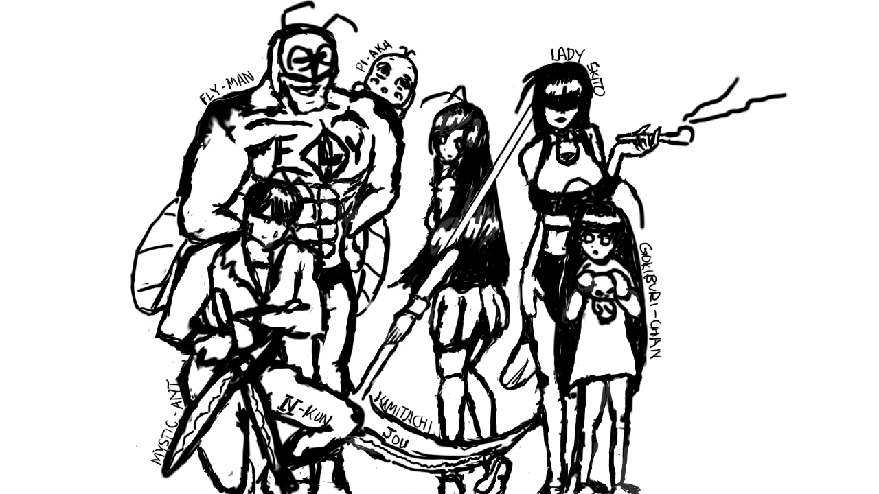 Starring: N-kun (Ant), Kamitachi-jou (Mantis), FLYMAN (Fly), Lady Skito (Mosquito), Gokiburi-chan (Cockroach), Pi-aka (Caterpillar)