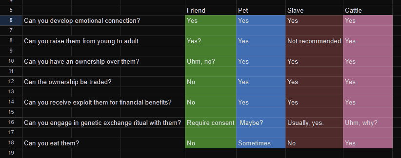 What are the differences between a friend, a pet, a cattle and a slave?