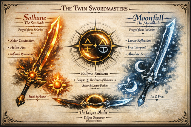 The story follows twin siblings born under a solar eclipse, each carrying an opposing form of Qi Solar (Sun) and Lunar (Moon). Their existence contradicts imperial doctrine, turning them into hunted anomalies in a fractured continent.